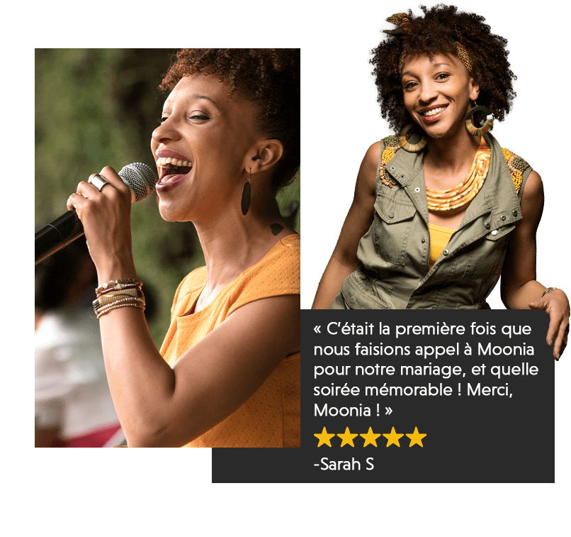 Chanteuse professionnelle depuis plus de 15 ans, Moonia a su faire vibrer des centaines de convives grâce à son répertoire éclectique et son interprétation pleine d’émotion.
